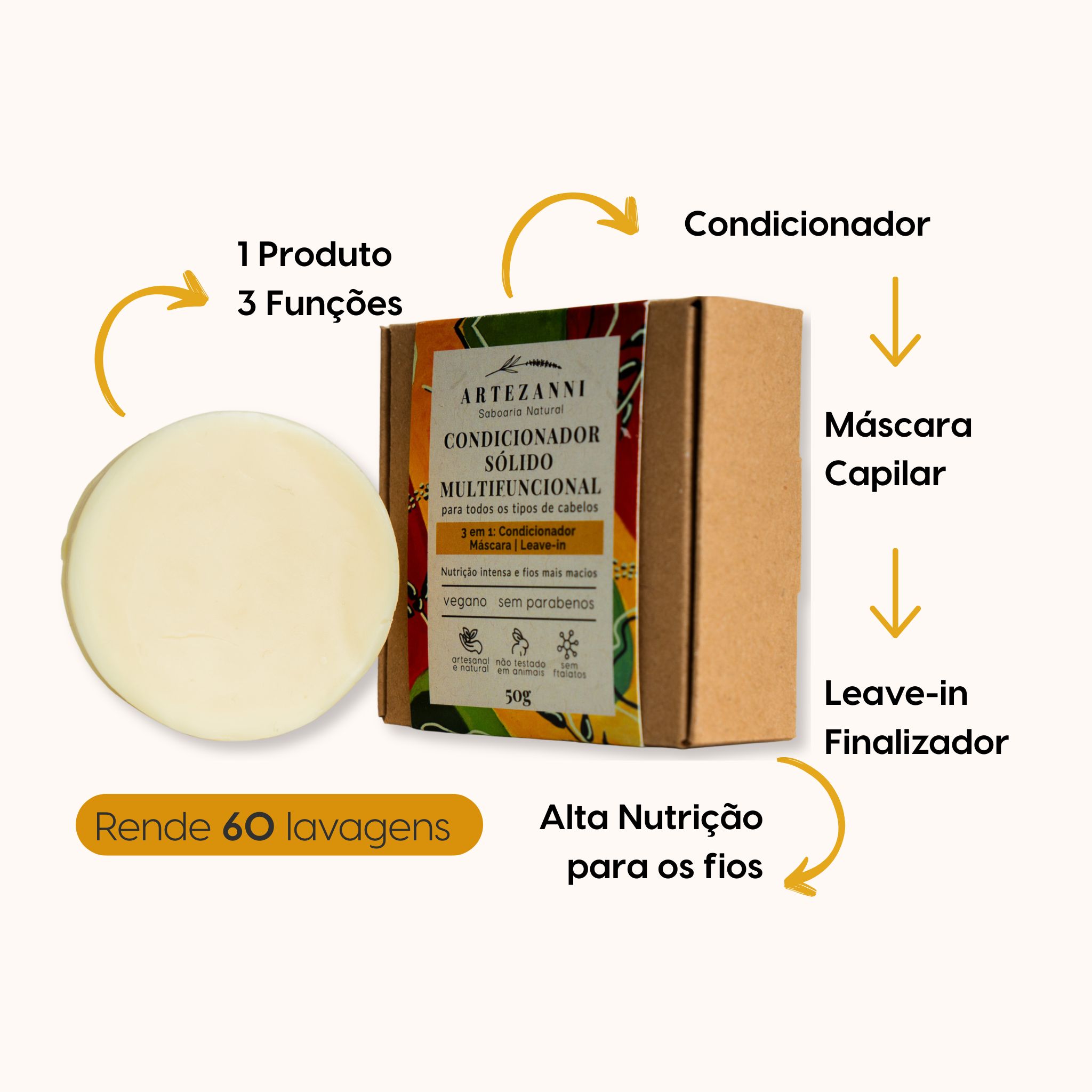 Nosso condicionador sólido natural foi desenvolvido para ser multifuncional: pode ser usado como condicionador, máscara hidratante ou finalizador (leave-in). Sua fórmula equilibrada, com óleos e manteigas nobres, proporciona hidratação intensa, nutrição profunda e proteção, deixando os fios macios, saudáveis e com movimento natural.